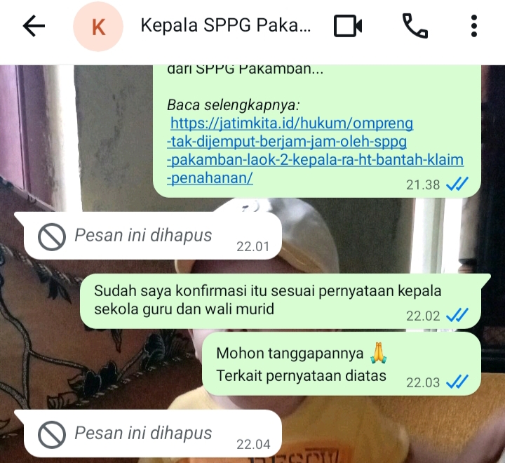 SUMENEP, Jatimkita.id – Sikap Kepala SPPG Pakamban Laok 2, Badri, menuai sorotan publik. Ia dinilai tidak konsisten dan tidak berkomitmen terhadap pernyataannya sendiri, setelah sejumlah pesan klarifikasi yang dikirimkan kepadanya justru dihapus tanpa jawaban substansial.