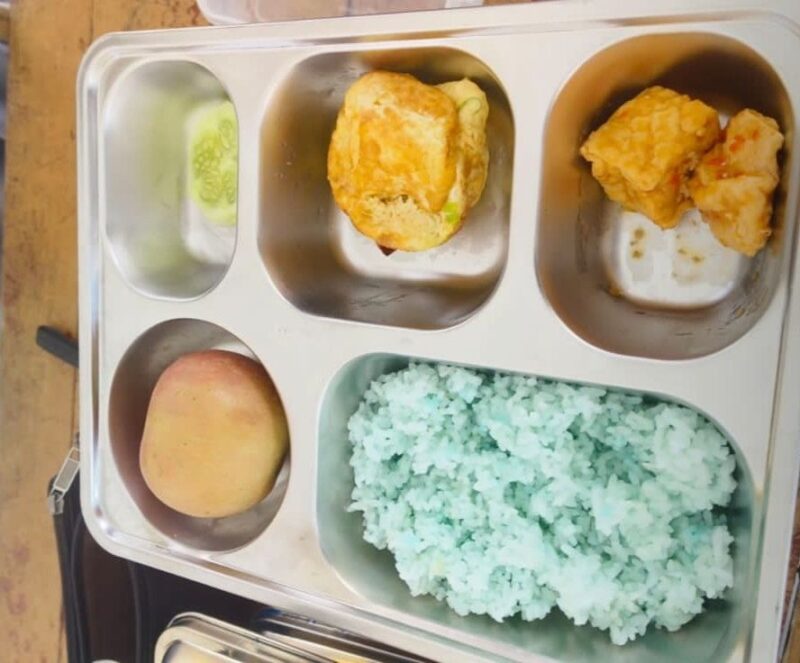 Dalam gambar yang beredar, menu MBG terlihat terdiri dari nasi berwarna kebiruan, telur goreng, tahu, serta buah dan sayur. Secara komposisi mungkin terlihat “lengkap”, tetapi dalam praktiknya gagal total dari sisi penerimaan.
