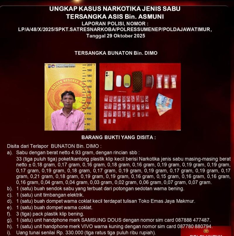 Sumenep, Jatimkita.id– Satresnarkoba Polres Sumenep kembali mengamankan dua terduga pengedar narkotika jenis sabu dalam operasi pada Rabu malam, 29 Oktober 2025, sekitar pukul 20.45 WIB. Penangkapan dilakukan di dua lokasi berbeda, yakni di pinggir Jalan Raya Rubaru, Desa Gunung Kembar, Kecamatan Manding, serta di rumah salah satu terduga di Kecamatan Rubaru.