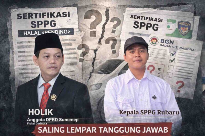 SUMENEP, Jatimkita.id – Polemik sertifikasi Satuan Pelayanan Pemenuhan Gizi (SPPG) Rubaru milik Yayasan Rumah Juang Garuda Emas kian memanas dan memantik kegelisahan publik. Pernyataan Anggota DPRD Kabupaten Sumenep Fraksi Gerindra, Holik, dan Kepala SPPG Rubaru justru dinilai memperlihatkan pola saling melepaskan tanggung jawab, alih-alih memberikan kejelasan atas persoalan yang menyangkut legalitas dan keamanan layanan publik.