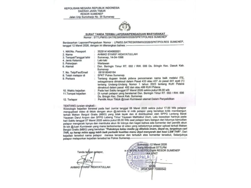 Organisasi profesi tersebut resmi melaporkan akun tersebut ke Polres Sumenep pada Kamis, 12 Maret 2026. Laporan itu tercatat dengan Nomor: LPM/53.SATRESKRIM/III/2026/SPKT/POLRES SUMENEP.