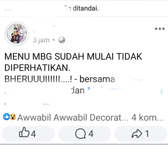 “Menu MBG mulai tidak diperhatikan, bheruuuiiii…! (basi, red),” tulisnya dalam unggahan yang menandai sejumlah guru lainnya, Selasa (19/11/2025).