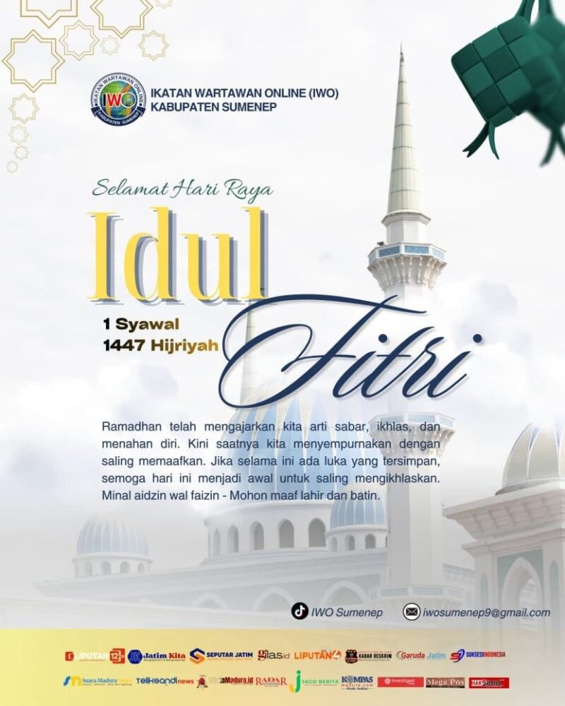 SUMENEP, Jatimkita.id – Keluarga besar Ikatan Wartawan Online (IWO) Kabupaten Sumenep menyampaikan ucapan selamat Hari Raya Idul Fitri 1447 Hijriah kepada seluruh masyarakat, khususnya di Kabupaten Sumenep.