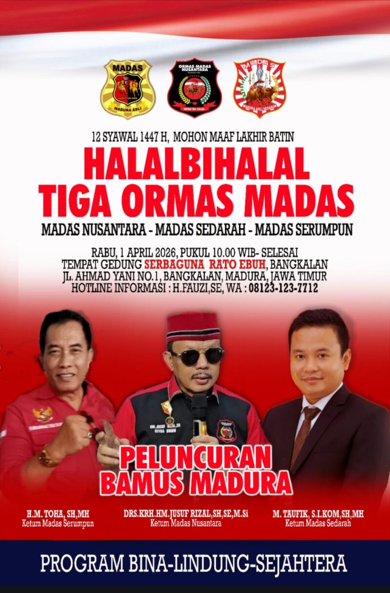 BANGKALAN, Jatimkita.id – Tiga ormas ke-Maduraan Madas akan menggelar halalbihalal, Rabu,1 April 2026 di Gedung Serbaguna Rato Ebuh, Bangkalan, Madura. Pada kesempatan yang sama akan dilaunching Bamus (Badan Musyawarah) Madura.
